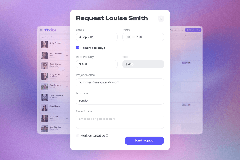 Search or filter your network to find available freelancers. Click-to-book them directly from your calendar to theirs for quick confirmations.